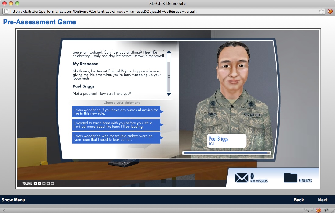 XL-CITR is a comprehensive training solution that accelerates learning by combining best practices in instructional design, assessment of a learner’s KSAs, customized training content, feedback on the learner’s performance, and scenario-based game environments. While the initial case study involved teaching supervisors in the Air Force to detect and stop cyber insider threats, our template-based approach to developing content enables us to rapidly create accelerated training content for any topic. This becomes especially useful and attractive to organizations that want to reduce the amount of time employees spend in compliance training or for situations in which learners must get up to speed quickly.